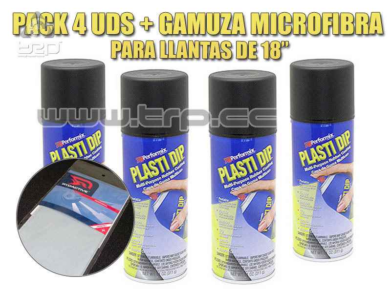 Conjunto de 4 botes de pintura Plasti Dip de color negro mate. Este pack esta pensado para la pintura de las 4 llantas de coche (1 bote por llanta). Incluimos en este pack una gamuza de microfibra especialmente recomendada para limpiar tanto las llantas como la carrocería y el interior del automóvil.